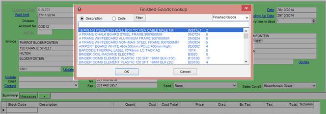 To add products to the quotation, click on the Stock Code field in the grid below the quotation information. You can then type in the product code and press enter. Alternatively you can double click the cell or press the “ALT” and “Z” keys on the keyboard simultaneously to bring up a search screen to search for the product that you require.