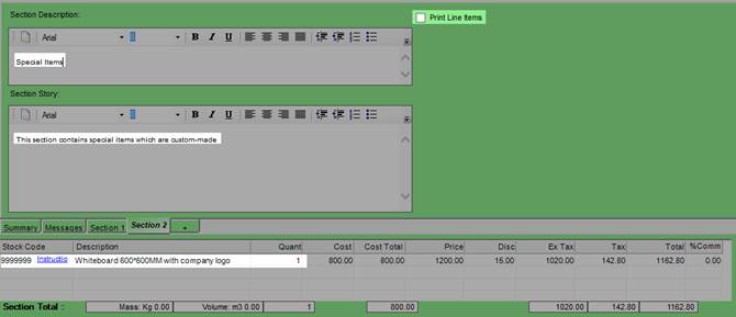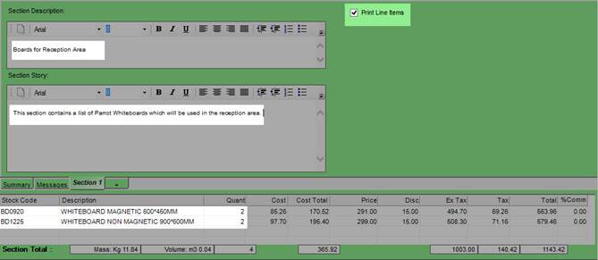 Sections can be used to break up the quotation into groups or allied products, or products for different departments etc. Each section can have its own description and additional information to explain the content or purpose of the section.