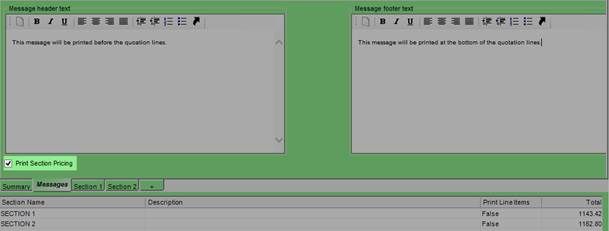Messages: On this tab you can add any information that will be printed on the quotation as a Header and Footer section.