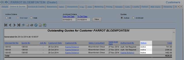 The sales quotation status can be viewed by going to the Search Documents screen to search for quotations, or by going to the Customers Screen and opening the “Orders & Quotes” tab and clicking on “Quotes”.