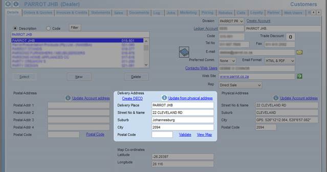 If the delivery address is the same for the order as for the customer (Customer screen and Orders screen), then the customer delivery address will also be updated with the new information when clicking on the Save button.