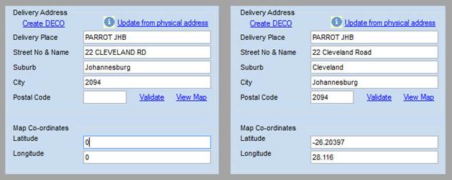 Below is an example of a delivery address that has not yet been validated (left) and the information returned (right) if the address was successfully validated.