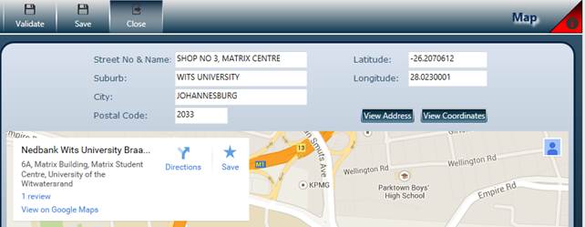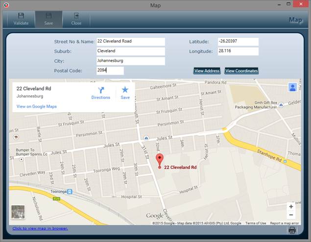 To view the location of an address on a map, click on the View Map link as shown in the image above. This allows you to visually see if the address is in the correct location.