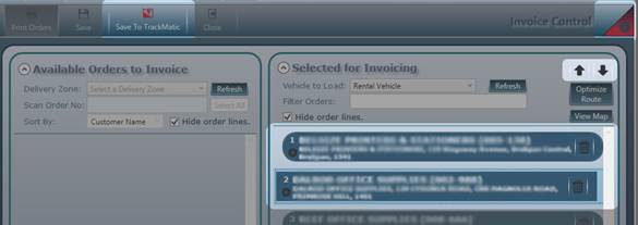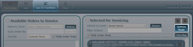 There are two ways to sort delivery routes. The first is to click on the “Optimize Route” button, the other is to click on the “Save To TrackMatic” button. These options will only be available if a delivery vehicle has been selected and if there are orders allocated to that vehicle.