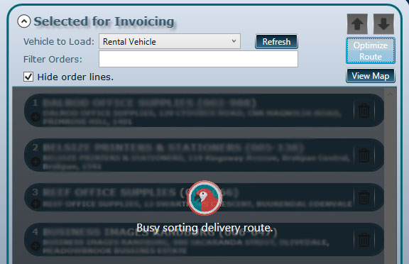When clicking on the “Optimize Route” button, a message will appear showing that the route is being sorted. Once the results have been returned from TrackMatic, the message will disappear and the orders will be sorted accordingly.