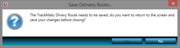 A pending “Save To TrackMatic” message will show the below message. Exiting the screen will not lose any data, you can come back at a later time and save the route to TrackMatic